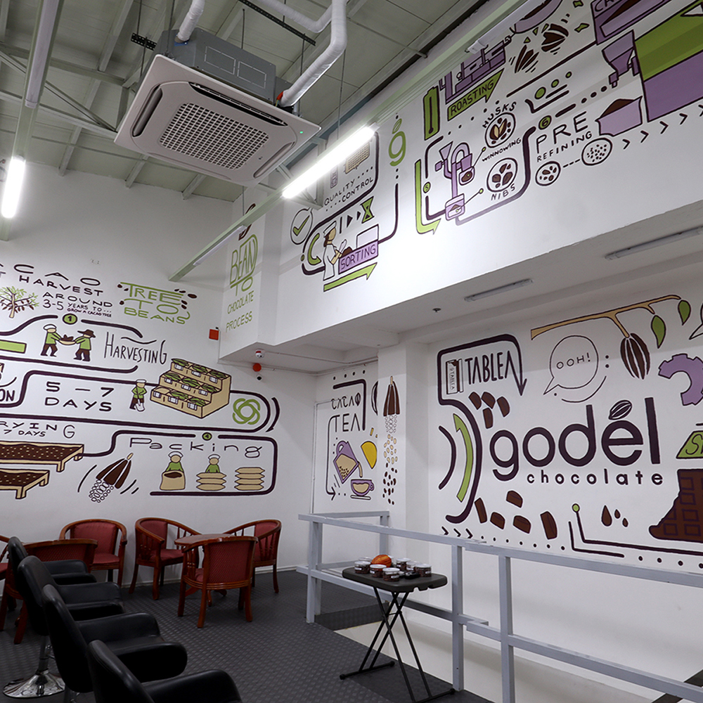Enjoy a welcome drink (hot or iced chocolate, of course!) and take photos at our lounge (Godel Chocolate product display and mural).
